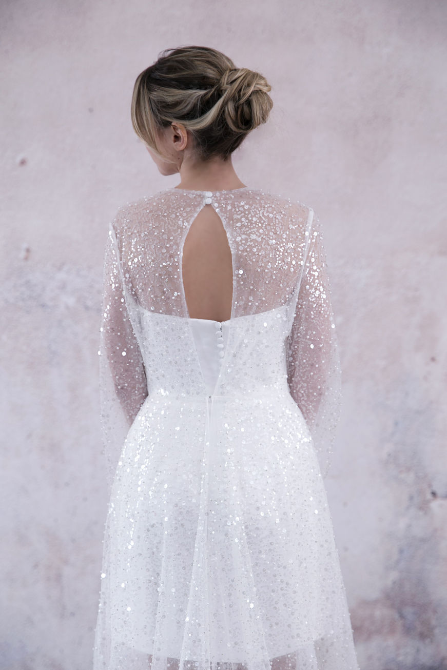 Step into sophistication with this long dress crafted from beaded sequins tulle. Designed for weddings in hot destinations, it offers modest coverage and exudes luxury and romantic allure. Perfect for wearing over a short dress, it allows brides to create a stylish and memorable ensemble.