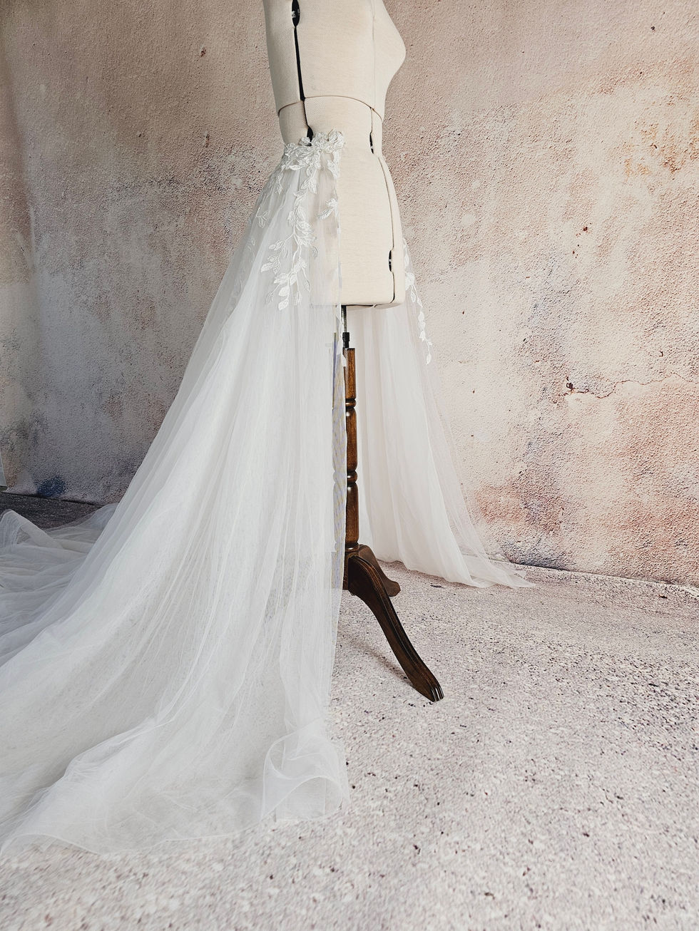 This 4-tier train has delicate leaflike lace detailing that cascades into a voluminous, flowing tulle skirt. The intricate lace patterns add a touch of elegance, while the long train creates a dramatic and graceful effect. The textured, neutral-toned background complements the dress's ethereal beauty.
