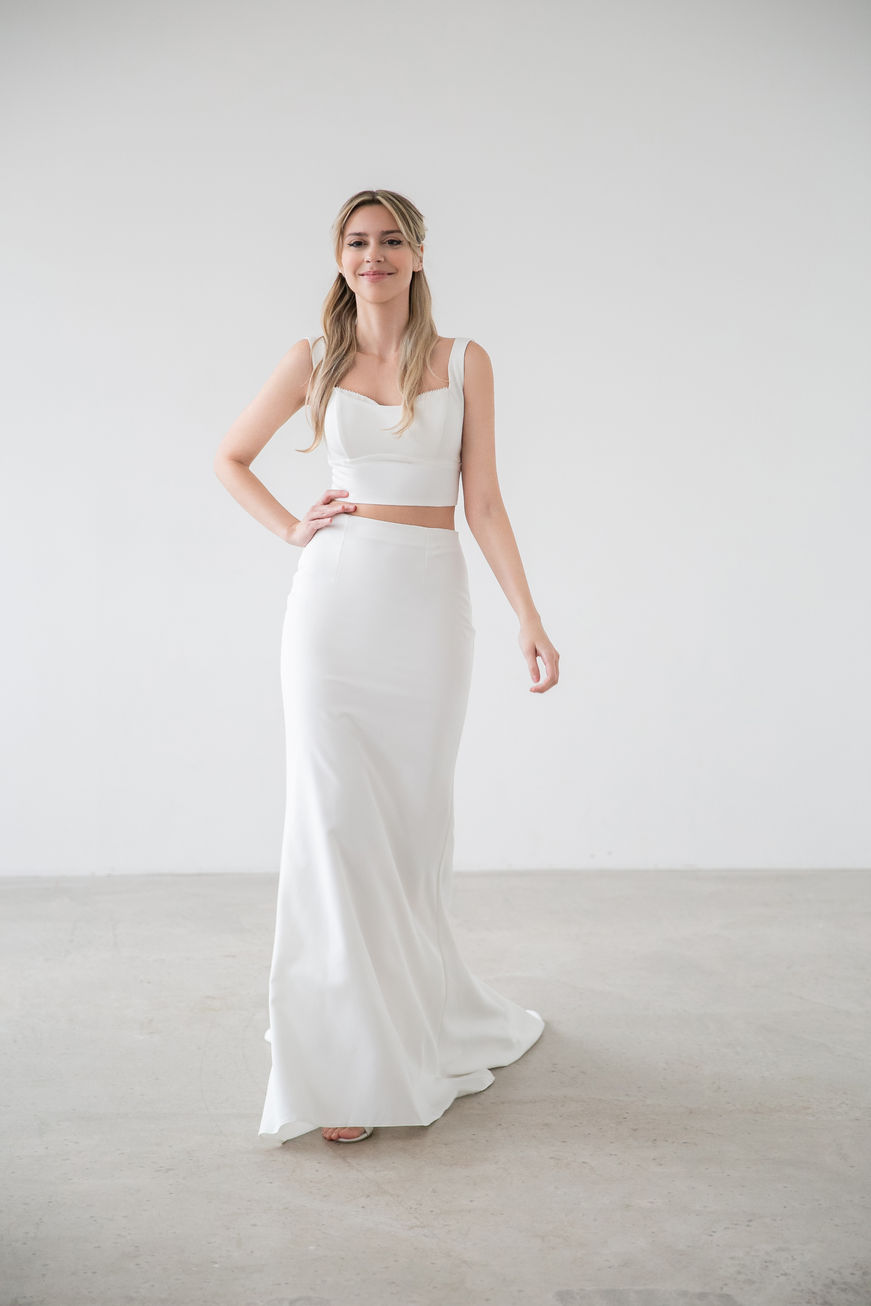 Introducing our Crepe Mermaid Overskirt – a chic and timeless addition to your bridal ensemble. Crafted for elegance, simplicity, and a clean aesthetic, this piece effortlessly enhances your silhouette. Elevate your wedding day look with this sophisticated mermaid-shaped overskirt made from luxurious crepe fabric.