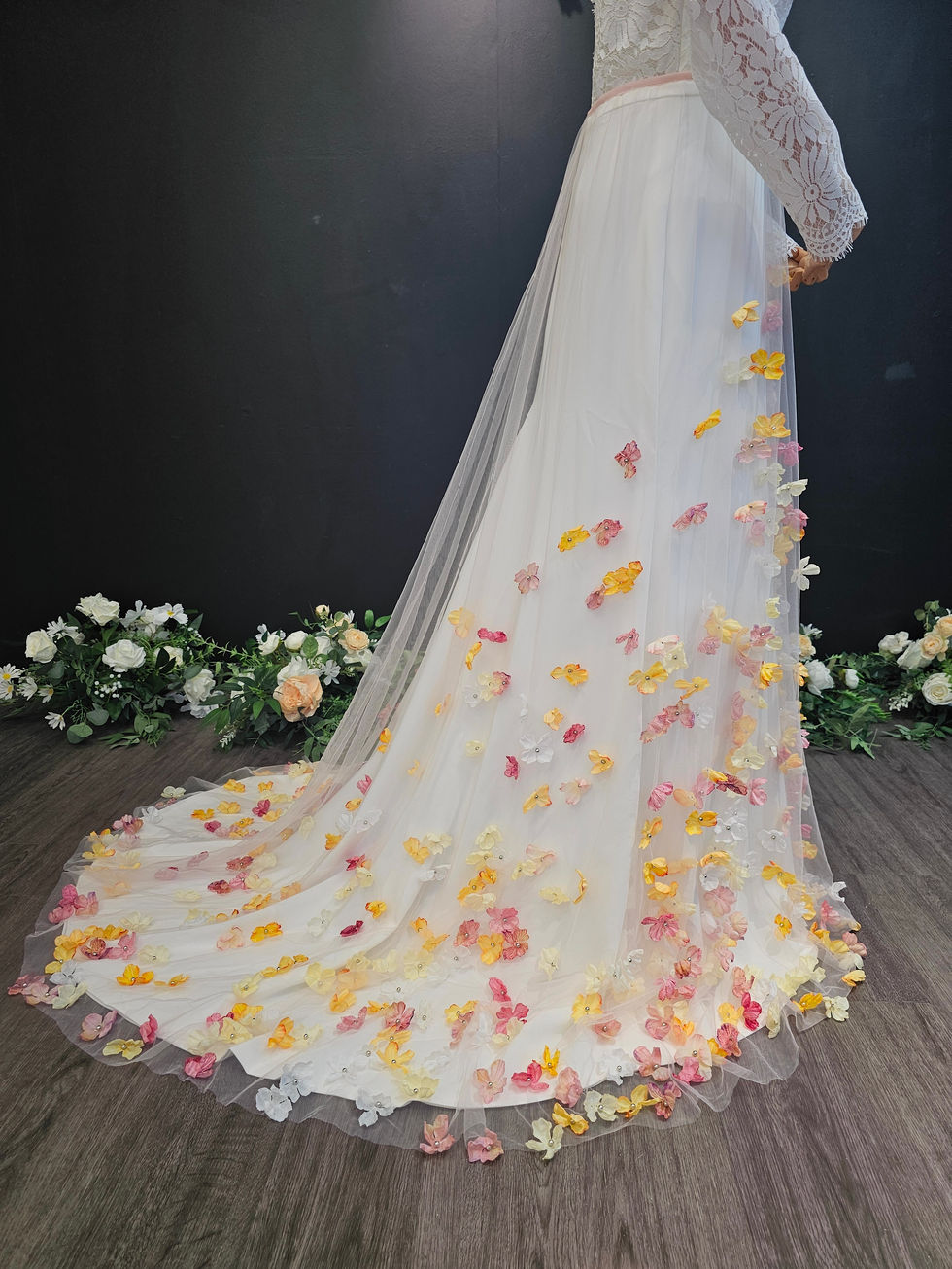 Celebrate spring and summer in bloom with this floral tulle wedding overskirt, adorned with vibrant pink, yellow, and deep rose flowers. Light and airy, it adds a whimsical burst of color and a fresh, romantic touch to your bridal look.