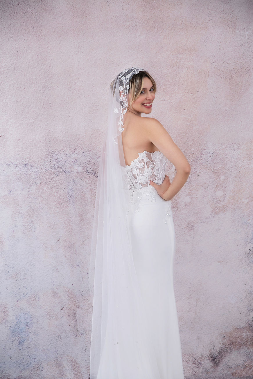 Adorn your bridal ensemble with this exquisite wedding veil, meticulously crafted from super soft bridal tulle adorned with elegant lace. Designed to accentuate the top of the head, it leaves the back plain, ensuring all dress details remain visible. This design choice adds a touch of grace and refinement, making it an ideal complement for showcasing your gown while adding a timeless and elegant flair to your wedding day look.