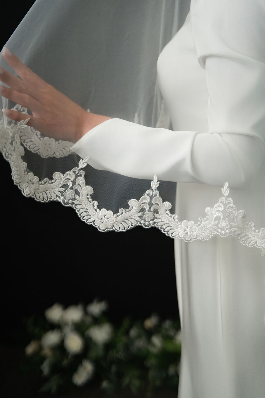 V25015 Randi - Two tiers super soft tulle and beaded lace edging veil, Lace veil