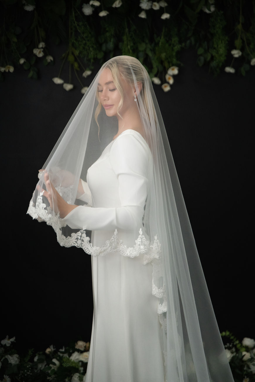 This elegant wedding veil is made from super soft tulle for a lightweight, airy feel. Highlighted by a beaded lace edging, it adds a subtle sparkle and refined detail to complete your bridal look.