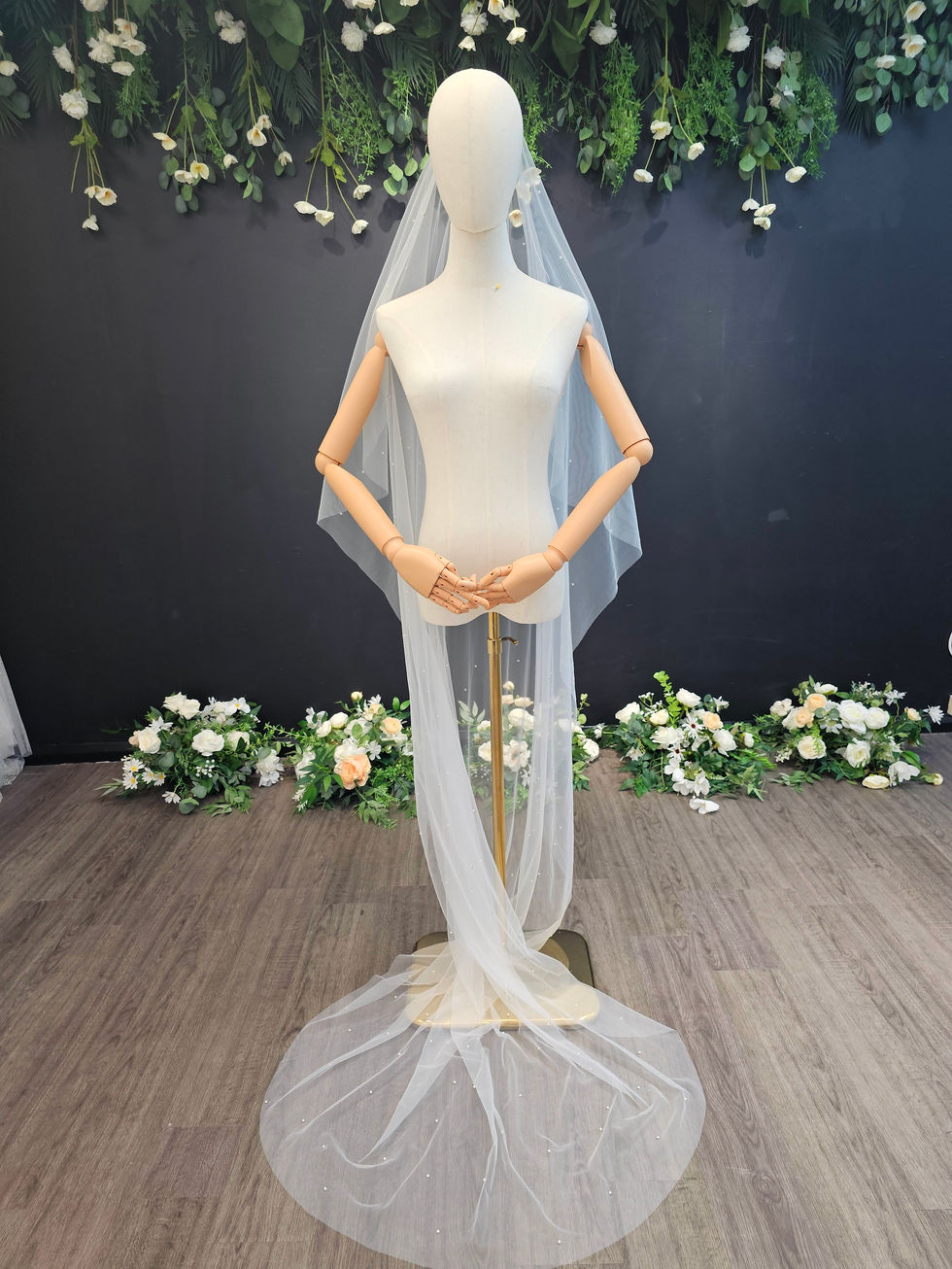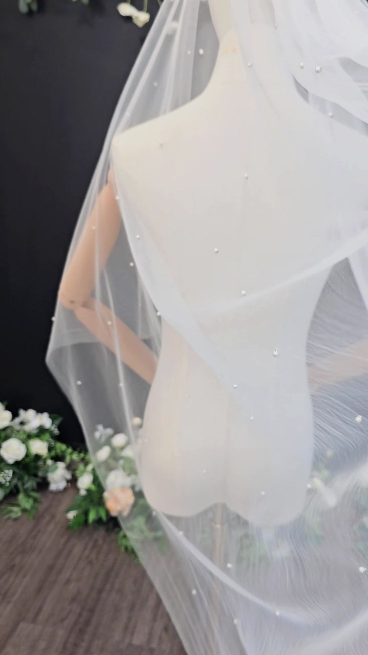 V25029 Tawnie - Pearls tulle veil, tulle veil with mini pearls, waterfall style