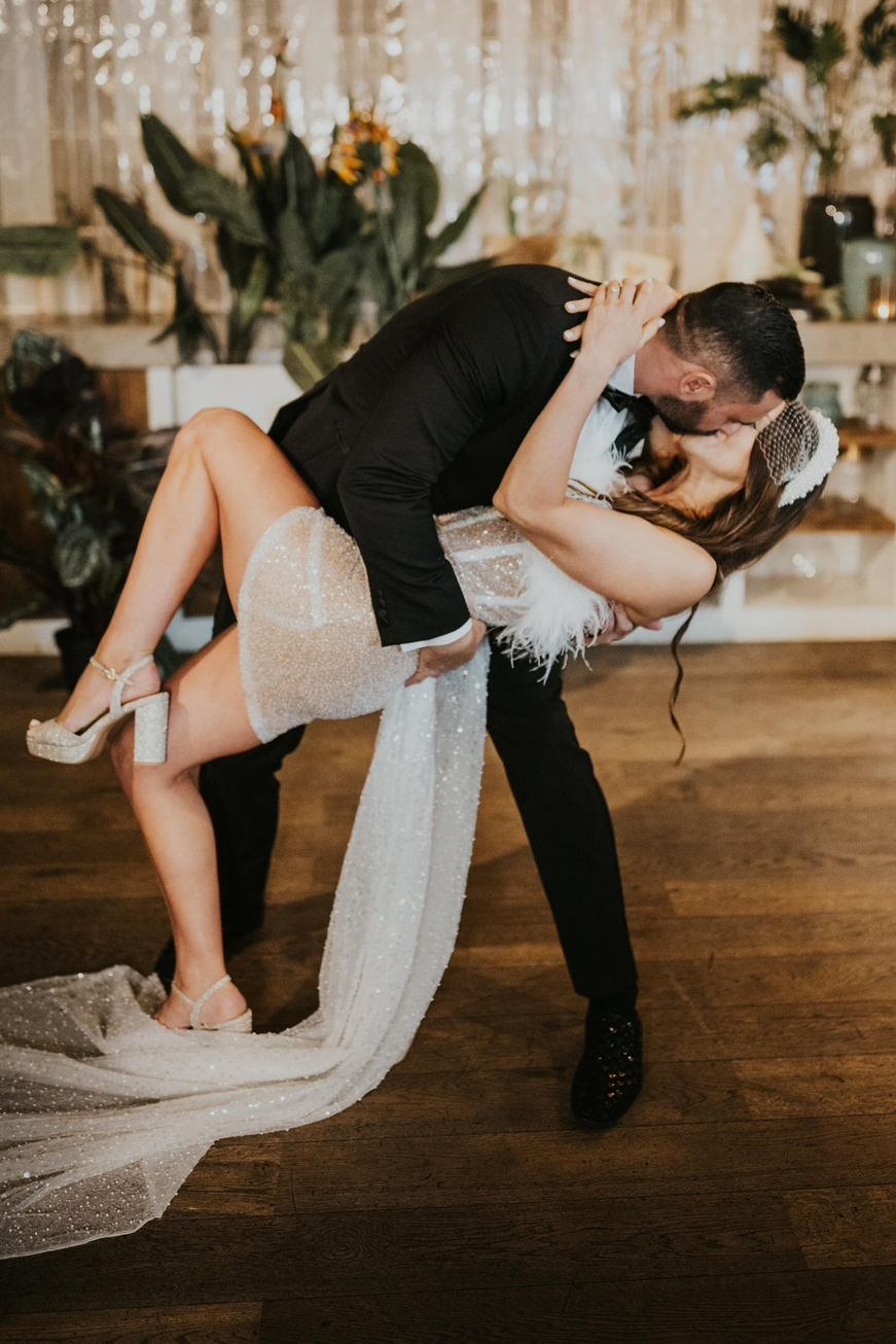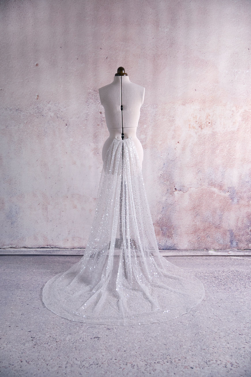 This stunning sequins beaded train is a statement piece that radiates luxury and elegance. The train is crafted from fine, shimmering fabric intricately adorned with delicate beads and sequins, which catch the light beautifully, creating a dazzling effect as it trails behind. The fan-shaped design adds a unique and dramatic flair, enhancing the overall grandeur of the bridal look. Removable for versatility, this train allows the bride to transition seamlessly from a dramatic entrance to a more relaxed reception style, all while maintaining an air of sophistication and grace. It's the perfect addition for a bride looking to make a memorable impression.